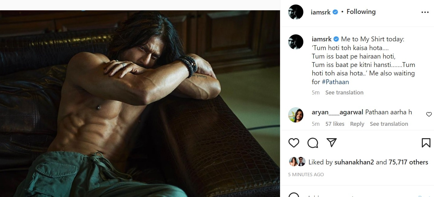 While sharing the photo, he was also heard thinking about his missing shirt, as his caption read, “Me to My Shirt today: ‘Tum hoti toh kaisa hota….Tum iss baat pe hairaan hoti, Tum iss baat pe kitni hansti…….Tum hoti toh aisa hota..’Me also waiting for #Pathaan”.