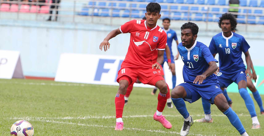 Kathmandu: Nepal has booked a place in the semi-finals of the U-19 SAFF football championship. In match held today at Dasharath Stadium in Tripureshwar, Kathmandu, Nepal defeated the Maldives by 4-1 to reach the last four.