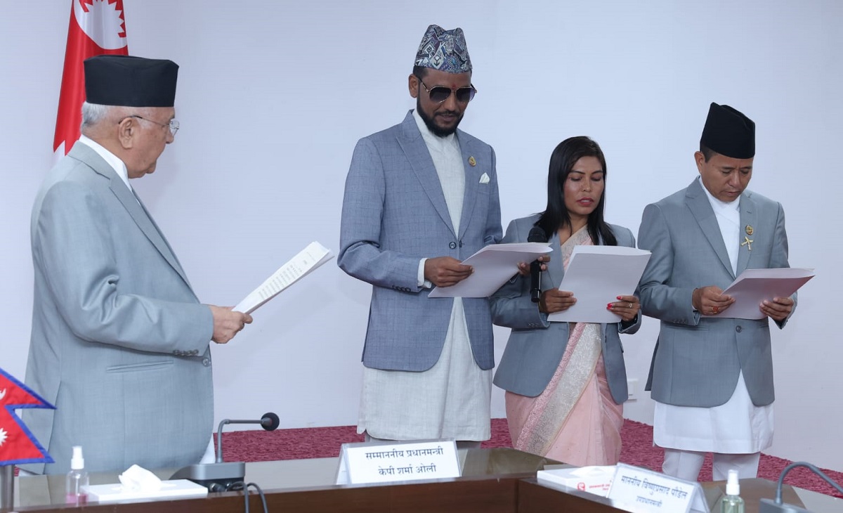 Those taking oath include the Minister of State for Culture, Tourism and Civil Aviation Arun Kumar Chaudhary; the Minister of State for Foresta and Environment Rupa BK and the Minister of State for Energy, Water Resources and Irrigation, Purna Bahadur Tamang. Present on the occasion were the Deputy Prime Ministers, Ministers, the Government Chief Secretary and high officials, among others.