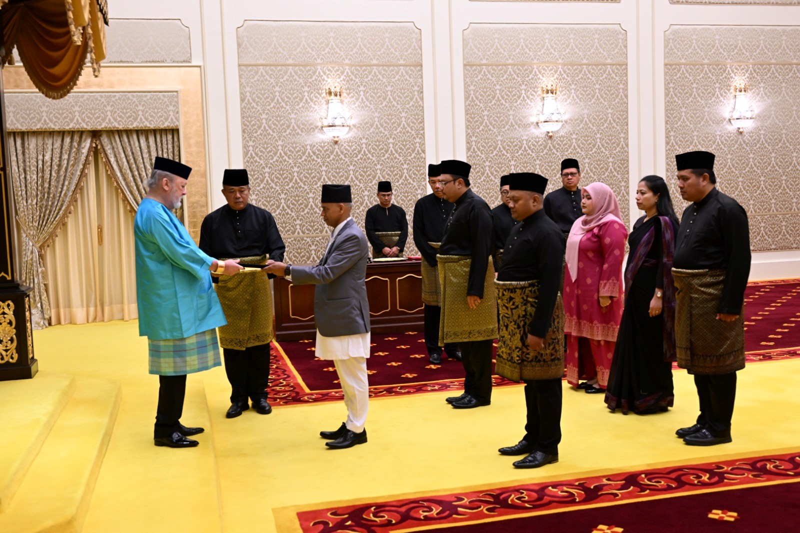 Upon arrival at the Palace, the Ambassador was accorded a Grand Salute by the Prestige Guard. The ceremony was collectively held for six incoming Ambassadors in Kuala Lumpur today.